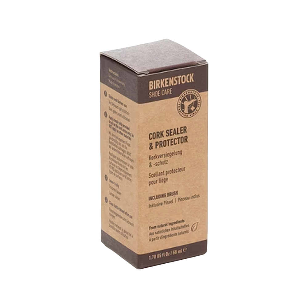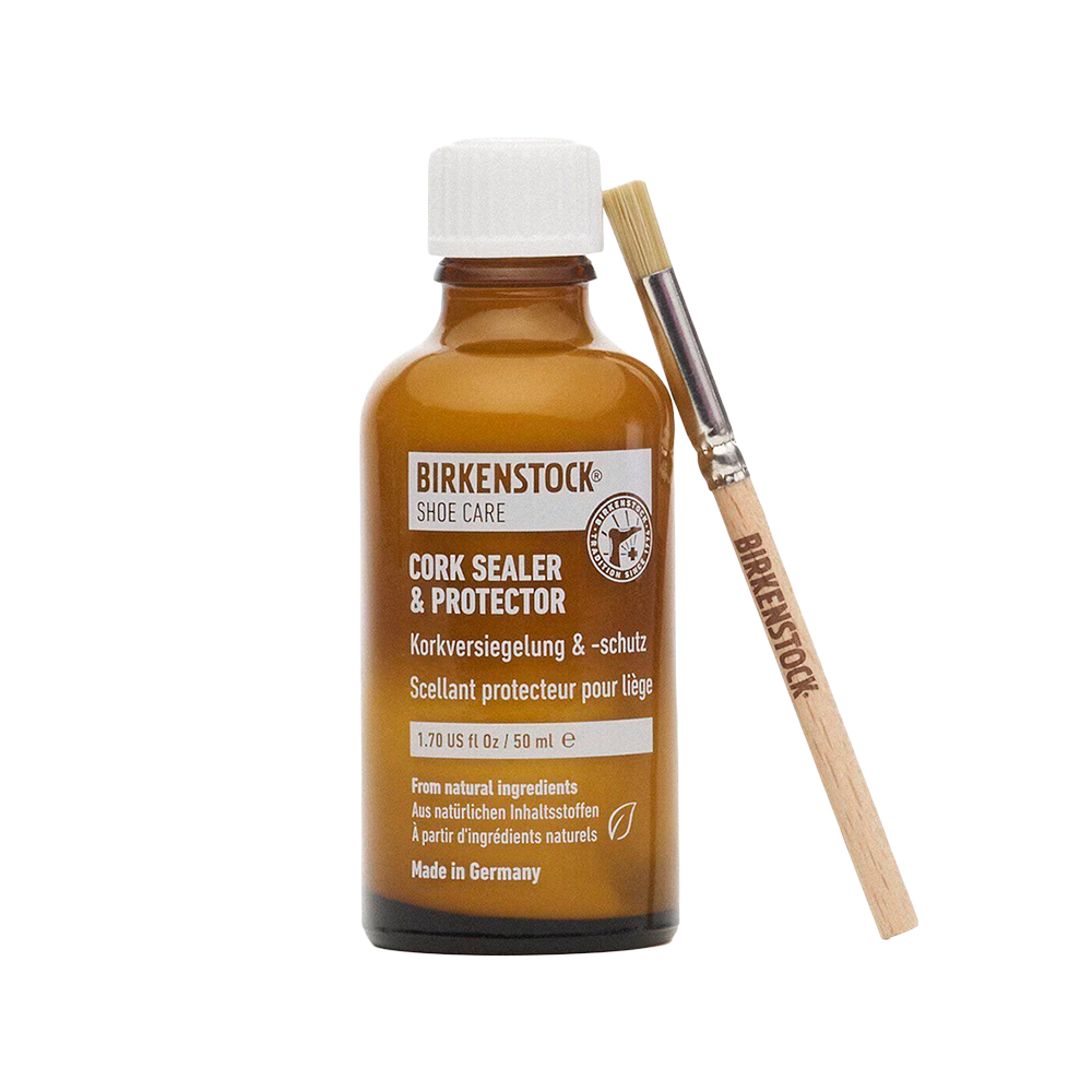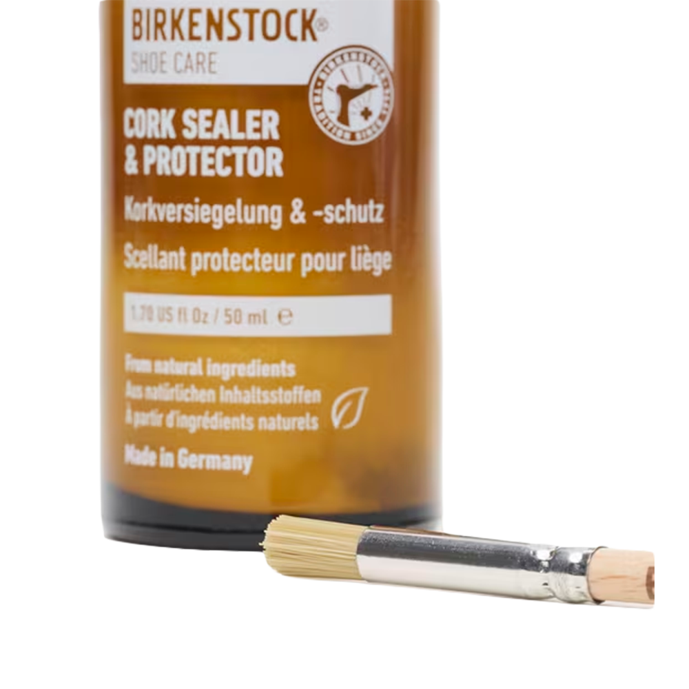 - Aplicación: ¡Agitar bien antes de usar! Aplicar una fina capa de Sellador y Protector de Corcho con la brocha sobre los bordes secos del corcho y extenderla uniformemente. Repetir el proceso en las zonas secas o frágiles según sea necesario hasta cubrirlas por completo. Dejar secar las sandalias BIRKENSTOCK durante la noche y revisar las zonas antes de volver a usarlas. IMPORTANTE: Asegúrese de que la plantilla y la parte superior de la sandalia estén cubiertas, ya que el producto puede manchar otros materiales.